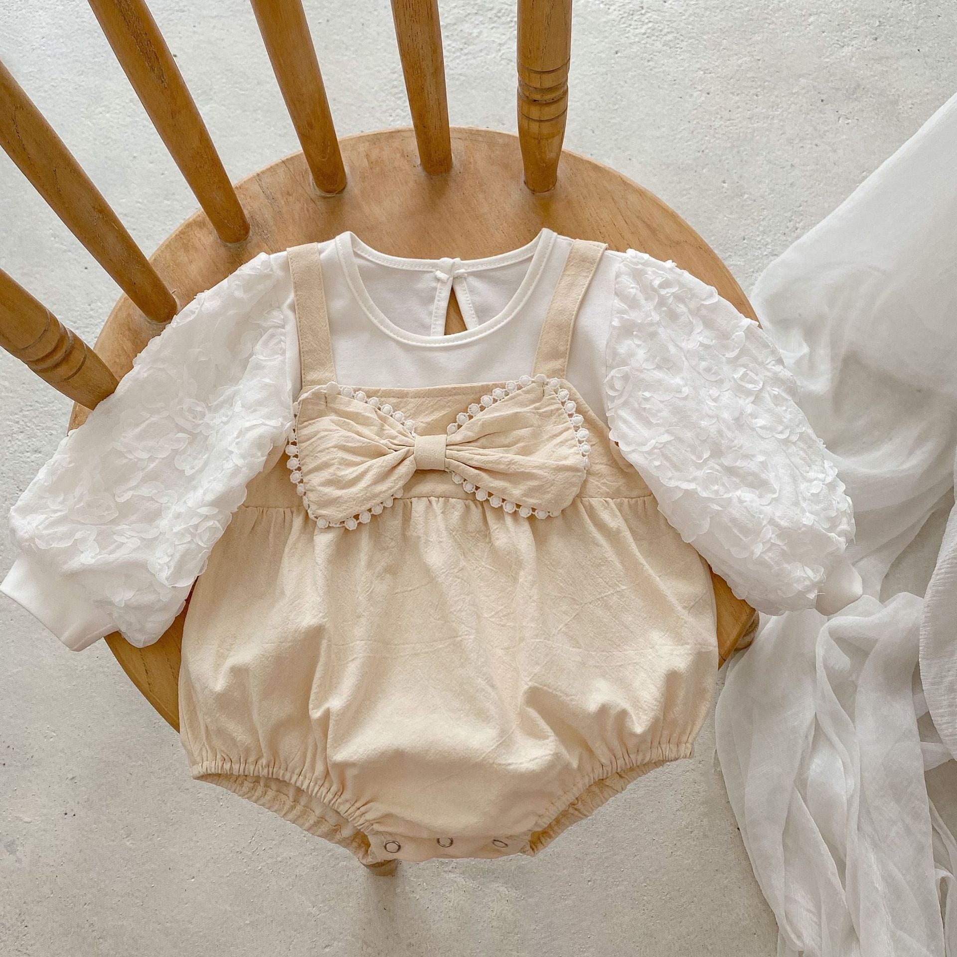 胸元のリボンがおしゃれで可愛いサロペットロンパース、女の子向けアイテムです。